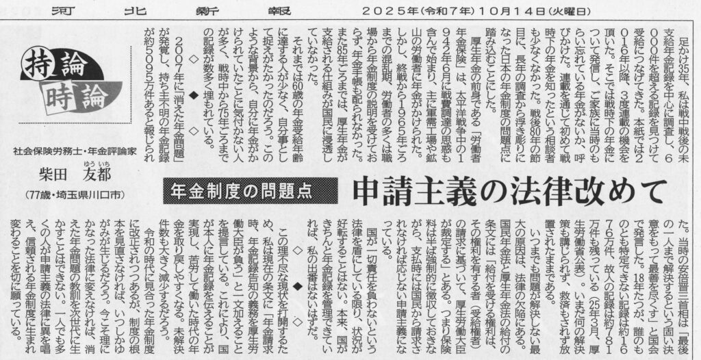「持論時論」 年金制度の問題点 申請主義の法律改めて